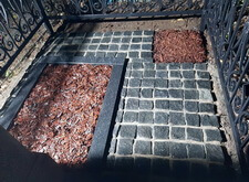 Тем временем мы изготовили табличку, закрывающую лицевую сторону надгробья, а также православный крест, венчающий памятник. Установка этих элементов завершила реставрацию памятника и мы взялись за укладку гранитной брусчатки, оставив в одном из углов участка место под квадратную клумбу. Брусчатку замыли водой и оставили высыхать, в цветник же насыпали мульчу. Окончание работ на данном месте захоронения происходило в тёмное время суток, так как для заказчика срочность благоустройства была одним из решающих критериев при выборе мастеров.